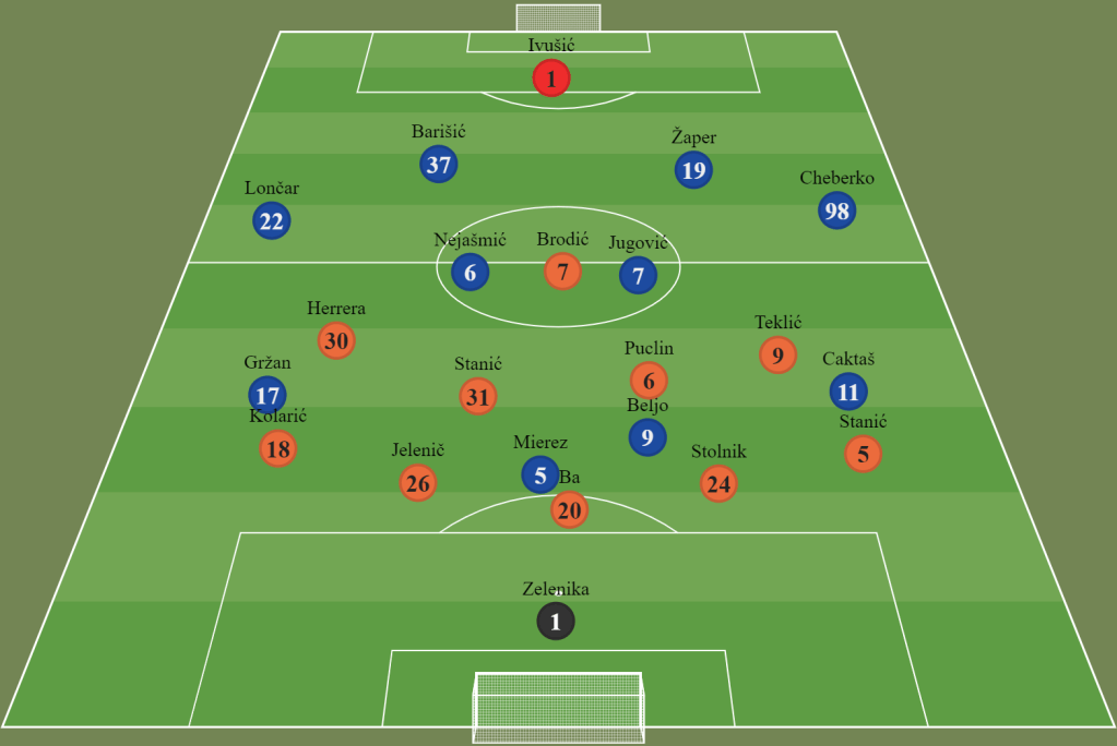 For this game, Kovačić decided to change Varaždin’s shape from 433 to 3511. It probably had to do with the players he had at his disposal (Šego – FC/WF injured and Ba DC returning from injury for this game). Their new shape allowed him to have a midfield diamond with a lot of creativity and possession oriented game, and better protection in case of a lost ball with Puclin(DMC) and three defenders (Jelenić, Ba, Stolnik) defending counterattacks in case of lost balls. Teklić also returned after 3 yellow cards suspension giving more creativity and a final pass or shot in finishing third.