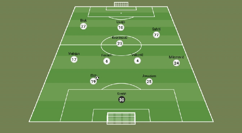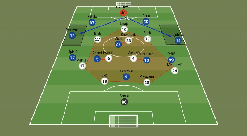 Karoglan decided to play in the 4411 formation in the defensive phase, with Krovinović and Livaja upfront. And something that looked like 433 or 4312, depending on the Sahiti and Krovinović movement or one of Hajduk’s standardized attacking mechanisms that were used.