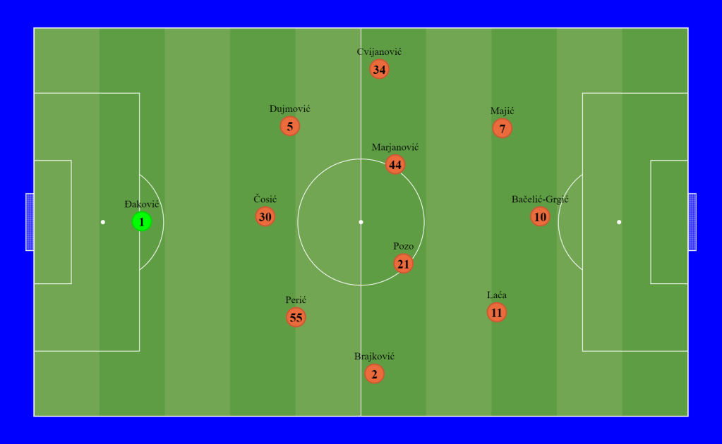 After scoring a goal, Carević made another change. Ćosić vent in for Božić, changing the system back to 3421 and closing the game.