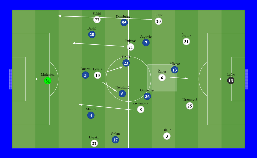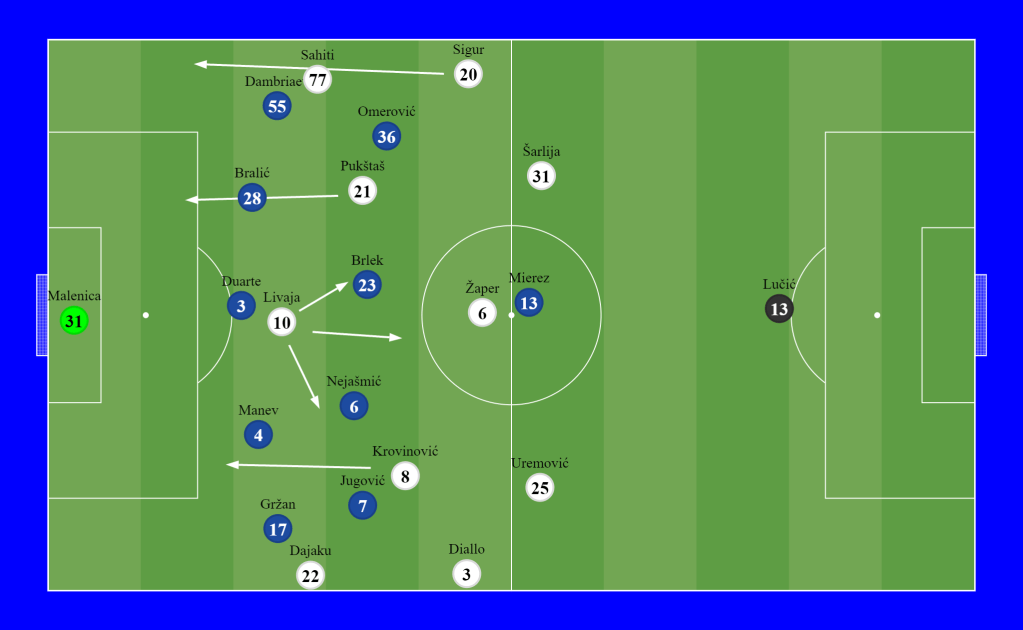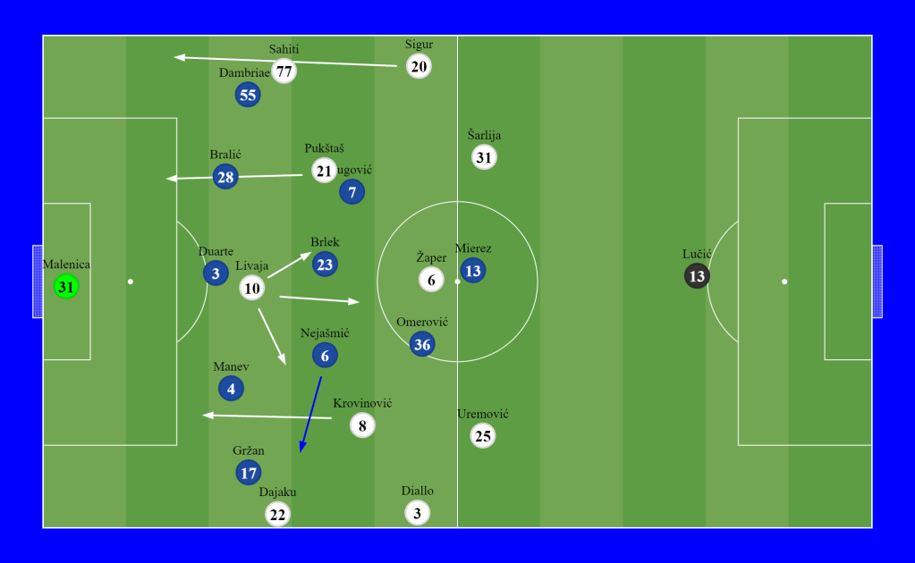 Hajduk reacted by lowering their lines and zonal defending, with occasional “trips” on the opponents’ half of the pitch. After ten minutes of the second half, it was evident that Hajduk’s midfield was losing a battle and could not retain possession. It was most apparent in Krovinović, so to keep him in the game longer, Karoglan sacrificed winger Dajaku and substituted him with right fullback Moufi. So Moufi went to right fullback position, Sigur went to left midfield eight positions, and “tired” Krovinović went on “vacation” to left winger position, doing absolutely nothing for his team, as always in the second half, but now at a less dangerous place.