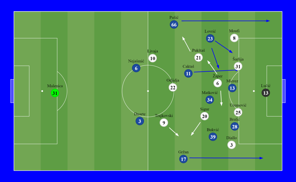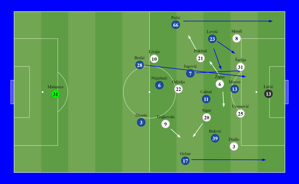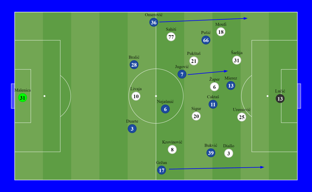In the final minutes, Zekić went all in. He was putting defender Bralić up in front to gain height for crosses, lowering Nejšmić to the CB position for distribution, and introducing 17 years old youngster Matković who went in for Jugović.