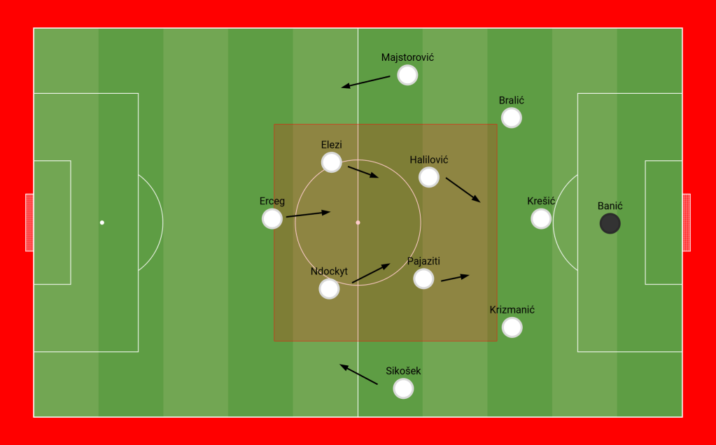 It was clear that Carević’s goal was to avoid conceding. Gorica played very compactly and defensively, trying to cover spaces in front of their box. The primary issue for Carević’s team was their possession strategy. Despite having creative players like Halilović, Pajaziti, Ndockyt, and Elezi, they struggled to develop cohesive ideas in buildup. The presence of multiple creative players crowded the midfield, suffocating one another and providing insufficient space for any possession idea to take shape. As a result, Gorica lost a lot of possession, and no one provided the necessary depth to allow for through passes, leading to catastrophic buildups filled with passing errors. This suffocating geometry in possession is unsustainable for Gorica in the long term.