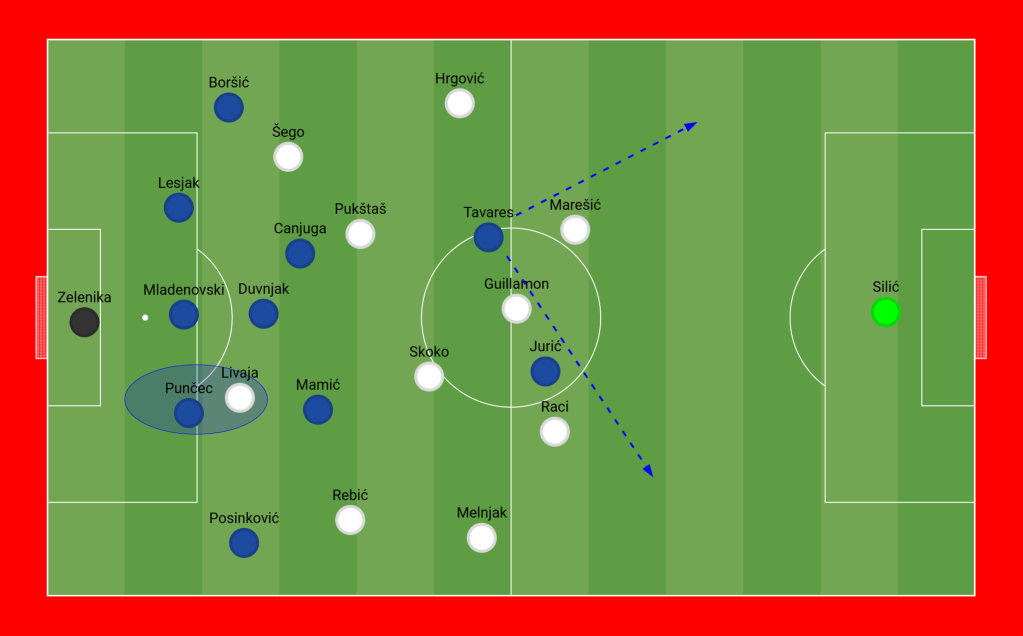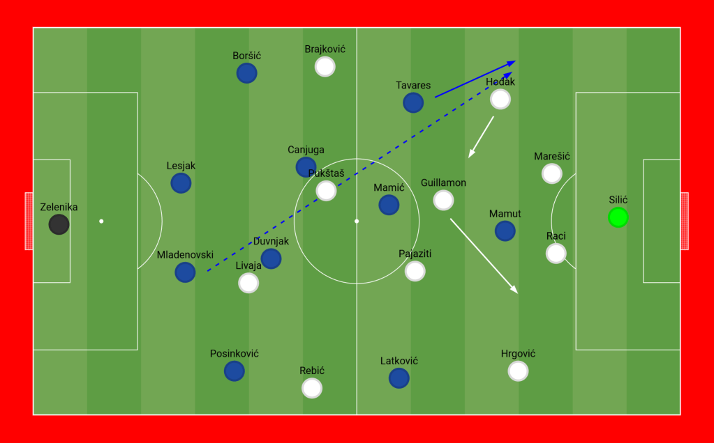 Šafarić took advantage of Hajduk’s buildup and positioning strategy, where the right fullback moved into midfield but was frequently late in his defensive duties. Varaždin created serious opportunities on their left wing by implementing diagonal passes to Tavares whenever possible.