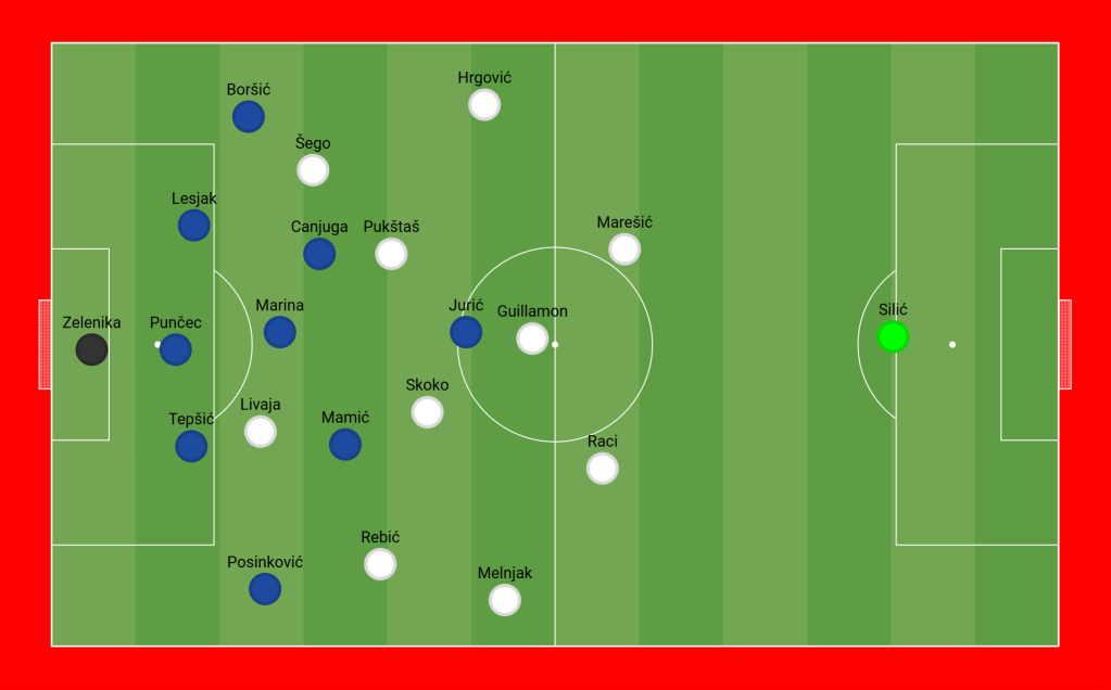 In the second half, Šafarić shifted to a 5-3-2 formation, further crowding the central corridor. Even after receiving a red card, they maintained their shape in a 5-3-1 formation.